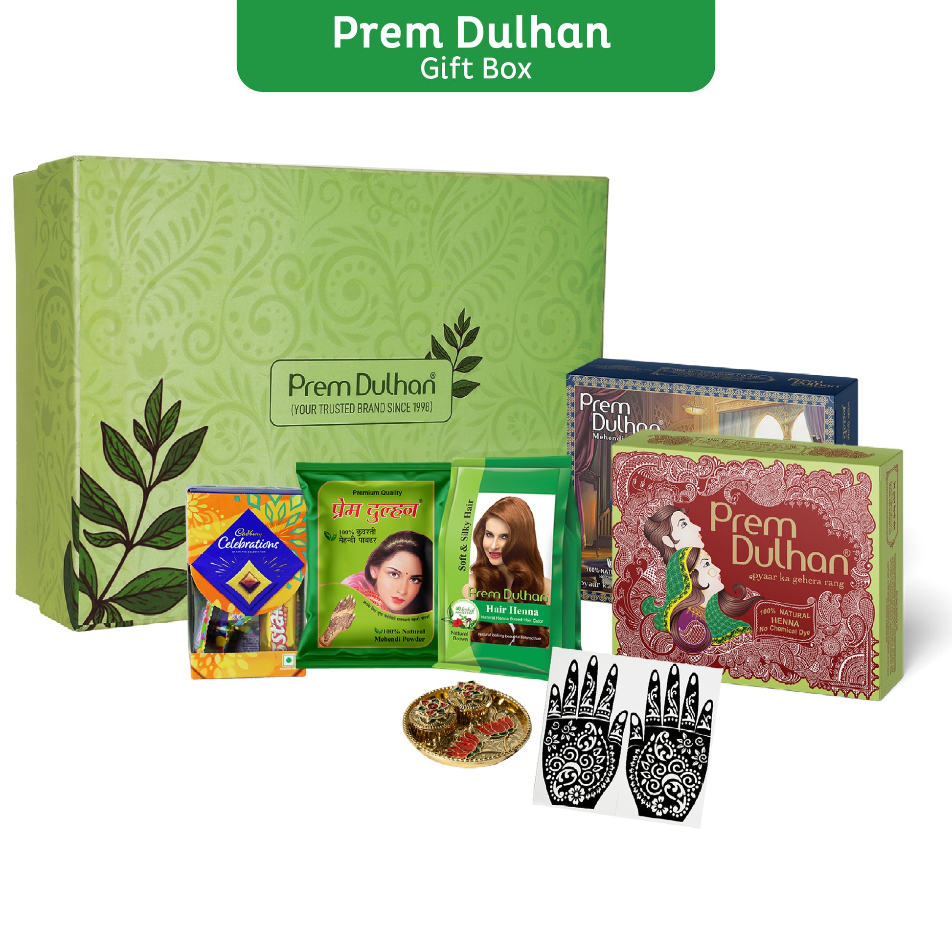 Prem Dulhan Festival Gift Box – Mehendi & Haircare Set is a thoughtful way to celebrate the spirit of Indian festivals.It brings together the goodness of 250 g Natural Mehandi Powder and 125 g Herbal Hair Henna in a natural brown shade.The box also includes 2 packs of ready-to-use Mehandi Cones with 12 cones each for easy application.A pair of artistic design stencils adds creativity and charm to your mehendi designs.To complete the festive touch, Kumkum Roli is included for traditional rituals.A Chocolate Kit adds sweetness and delight to the gifting experience.This gift box is a perfect blend of tradition, self-care, and joy for every festive occasion.