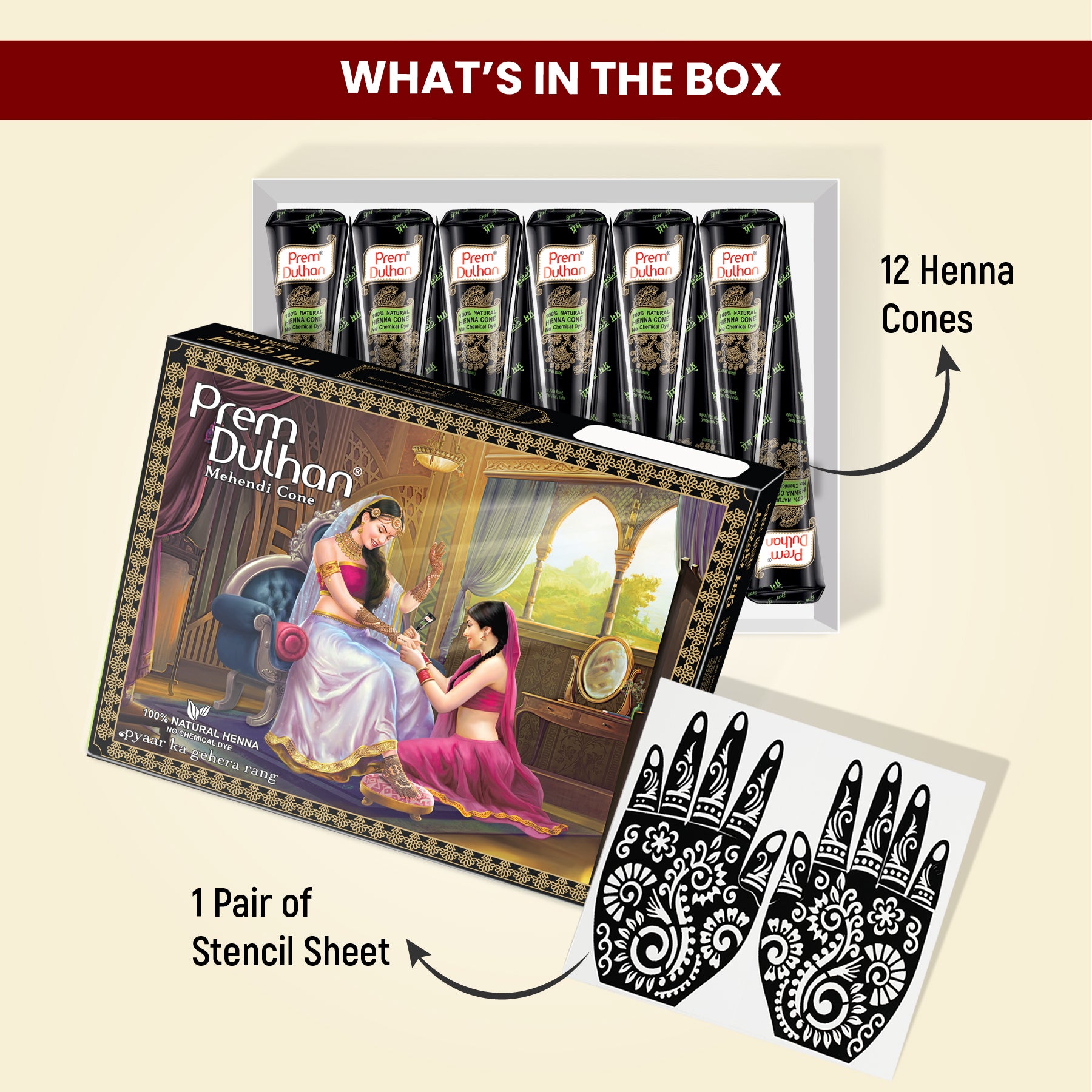 Prem Dulhan Ready to Use Mehendi Cones with Paisley Stencils Black Box