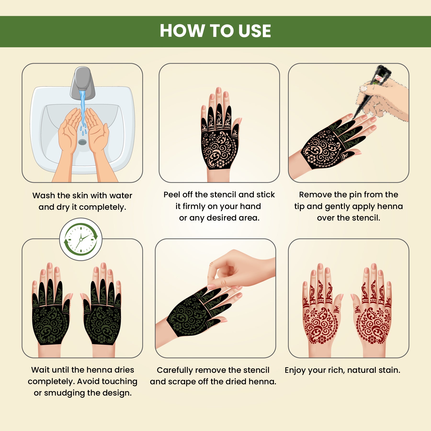 Lets create beautiful, intricate henna designs easily at home. Made from 100% natural henna leaves, it gives a rich, long-lasting color that’s safe for all skin types. The ready-to-use cone and design stencils help you achieve clean, perfect patterns in minutes - ideal for festivals, weddings, parties, and bridal functions. Quick, convenient, and chemical-free, this set brings a professional mehendi experience to every special occasion.